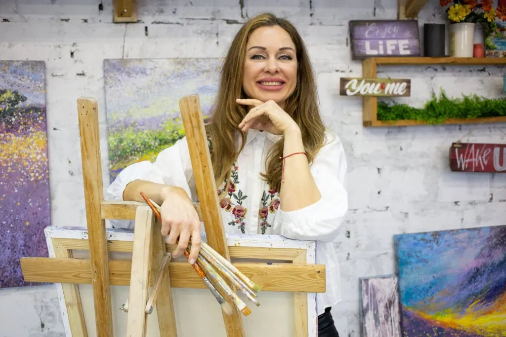 “Summer Landscape. Whispers of Warmth…” captures the golden serenity of summer through soft, flowing forms and vibrant hues. The paintings depict sunlit fields, gentle hills, and open skies in a dreamlike, abstract style, where each element shimmers with summer’s warmth.
