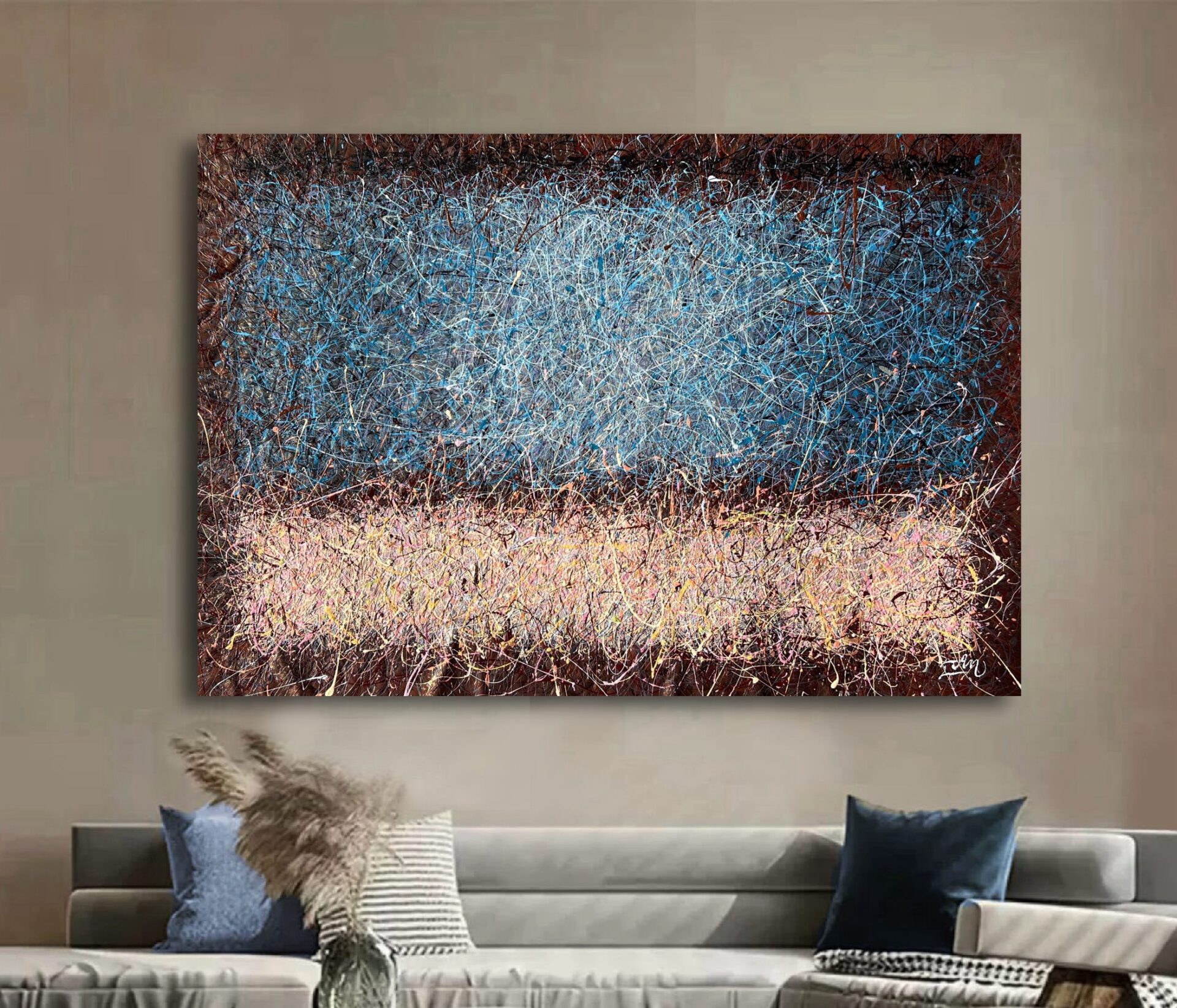 Elevate your interior with the captivating energy of an original Jackson Pollock-inspired abstract painting, rendered in serene tones. Perfect for lovers of unconventional and original design solutions, this artwork combines dynamic expression with a soothing color palette to create a unique focal point in any room. Its intricate splashes and layers invite contemplation and conversation, making it an ideal addition for those who appreciate both modern art and a tranquil atmosphere. Transform your living space, bedroom, or office with this stunning piece that seamlessly blends artistic innovation with elegant serenity.