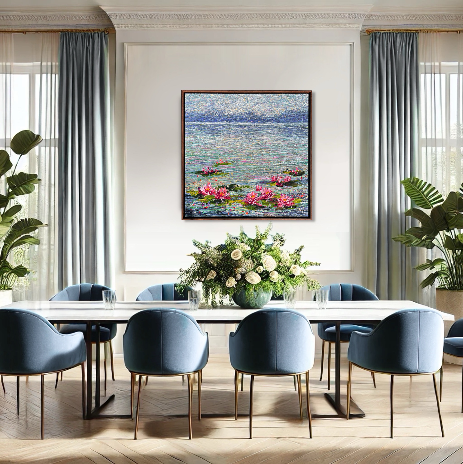 Soft shades, delicate lilies, a lake hidden beneath a thousand tiny splashes. A work for those who love silence, depth, and discovery.