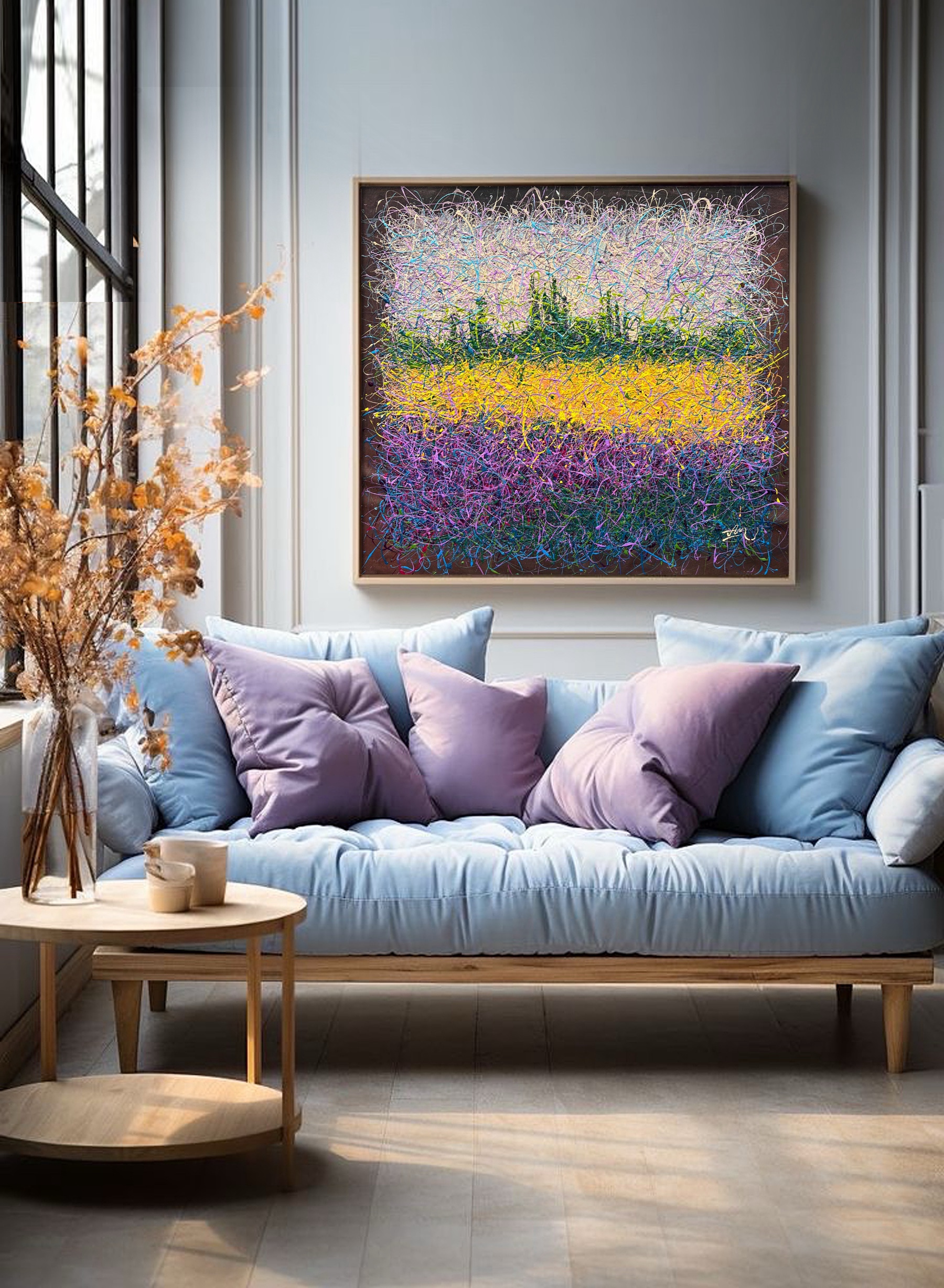 Additional borders of the canvas are painted so after stretching it can be hung with or without a frame as preferred.