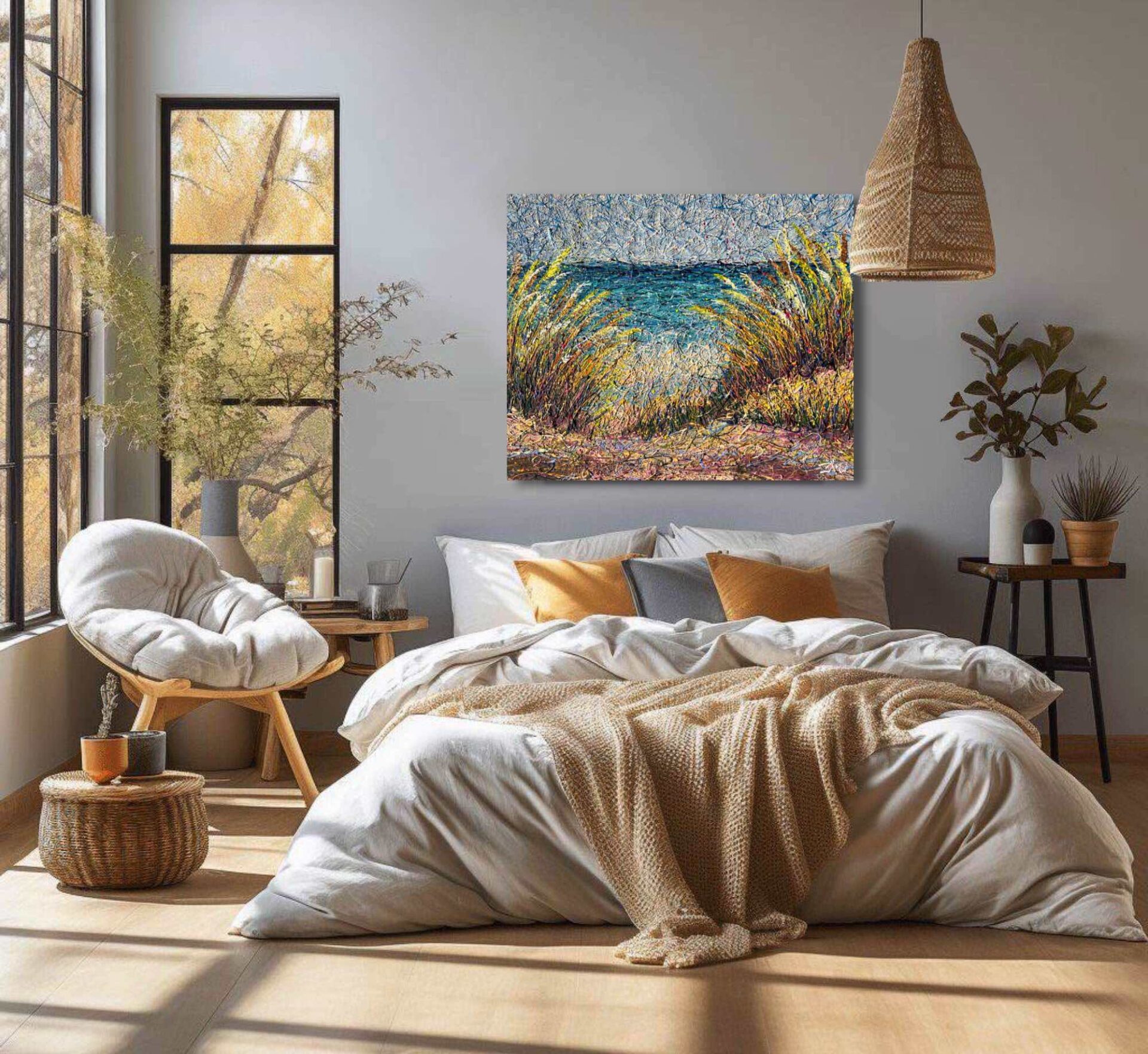 Transform your bedroom, living room, or office into a serene sanctuary with our stunning painting of a wave. This masterpiece captures the dynamic beauty and tranquil essence of the ocean, bringing a sense of calm and inspiration to your personal space. The vivid blues and gentle curves of the wave create a mesmerizing focal point that elevates your bedroom, living room, or office’s aesthetic, making it a perfect retreat for relaxation and rejuvenation. Embrace the soothing power of nature’s artistry and let this exquisite piece enhance the elegance and ambiance of your bedroom, living room, or office.