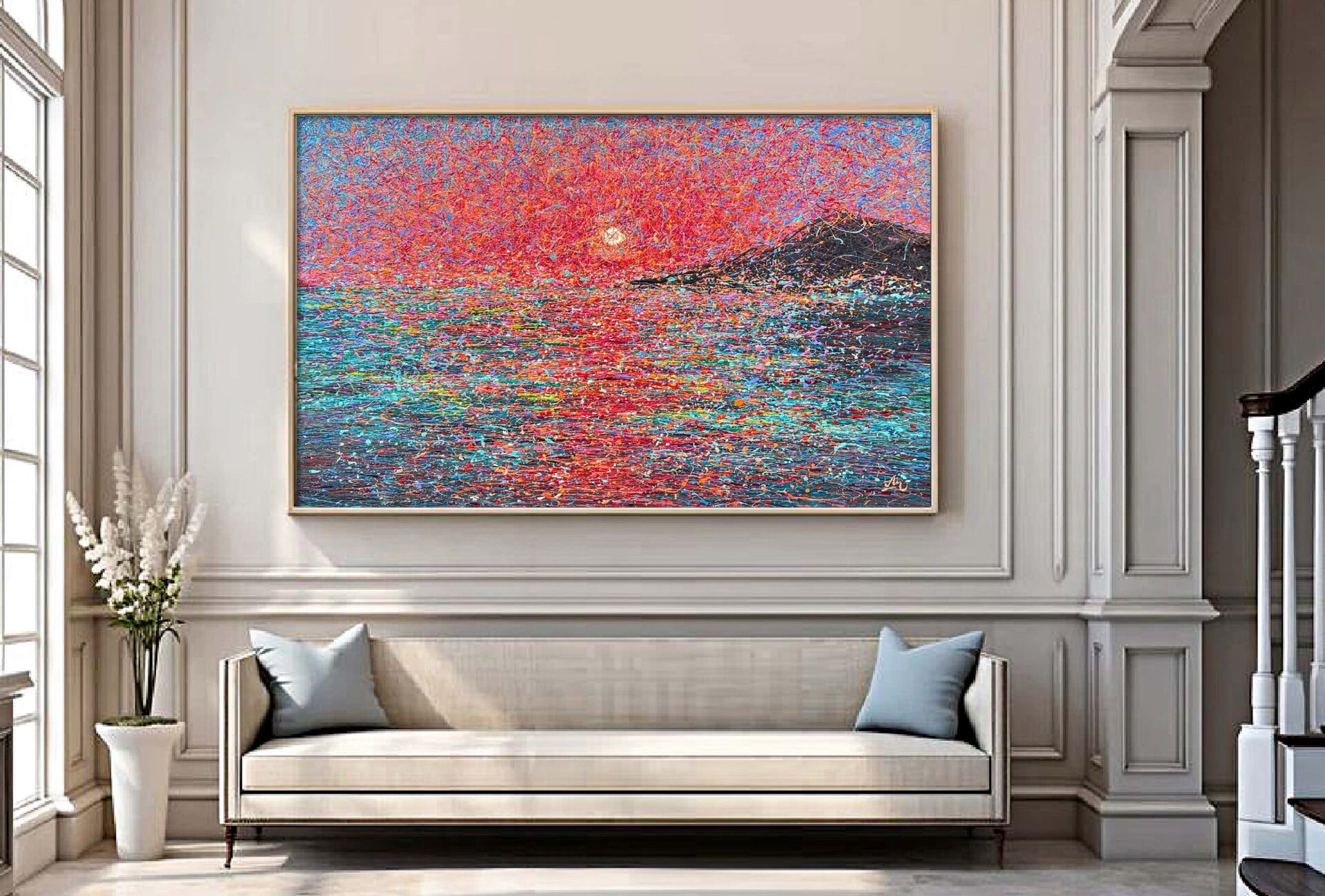 This one-of-a-kind modern painting captures the energy of a fiery morning — ideal for bold interiors, statement walls, or moody calm zones.