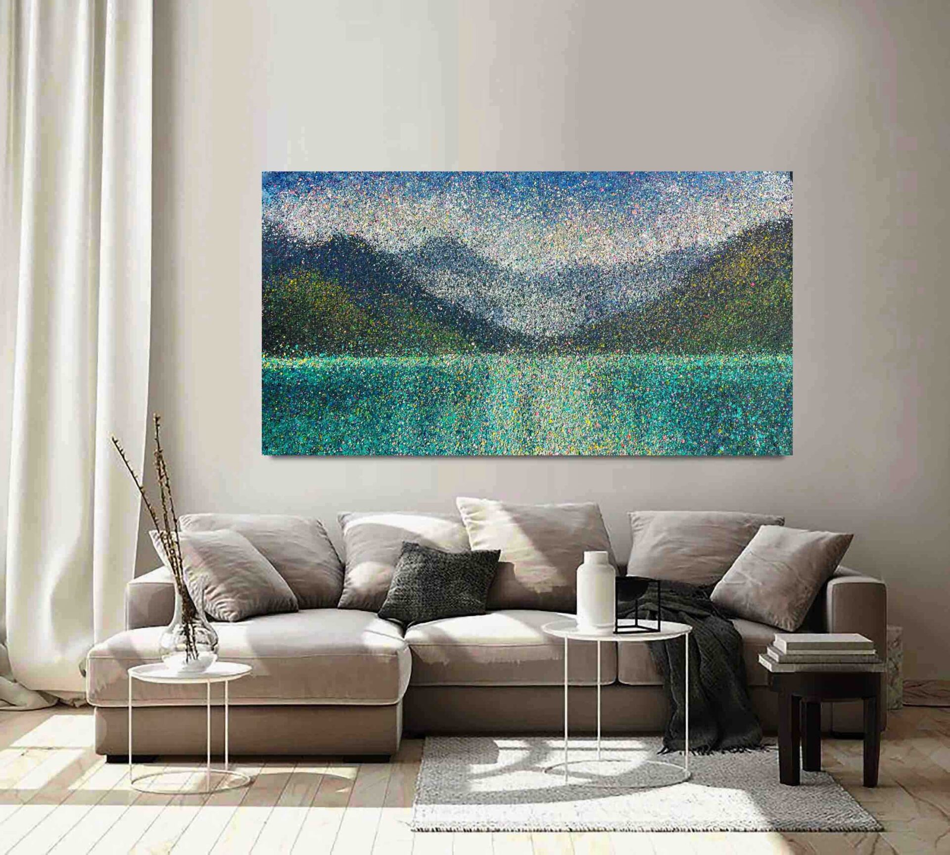 The painting in an abstract style with splashes of dots according to a given plot with an emerald lake and mountains.